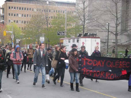 Alison: There have been a lot of solidarity rallies. In fact I’m going to one tonight. They do this thing every night in Quebec now, it’s called the Casseroles, where they go out in the street and bang on pots and pans, and that started to happen in the wake of the introduction of this law, Law 78, which is incredibly repressive and outlaws demonstrations. It was brought in response to the student strikes and the demos they were doing, and it just ended up enflaming the general public, so there have been a lot of solidarity rallies. I think in Ontario now, with the Canadian Federation of Students—a union, which started as a student solidarity network—I think the goal is to try to put structures in place around tuition fees and, not call a strike, but basically start to build in the same way they did in Quebec. The events in Quebec took years to build, the kind of infrastructure that was there and the student union movement took a long time, at least a couple of years if not longer.
