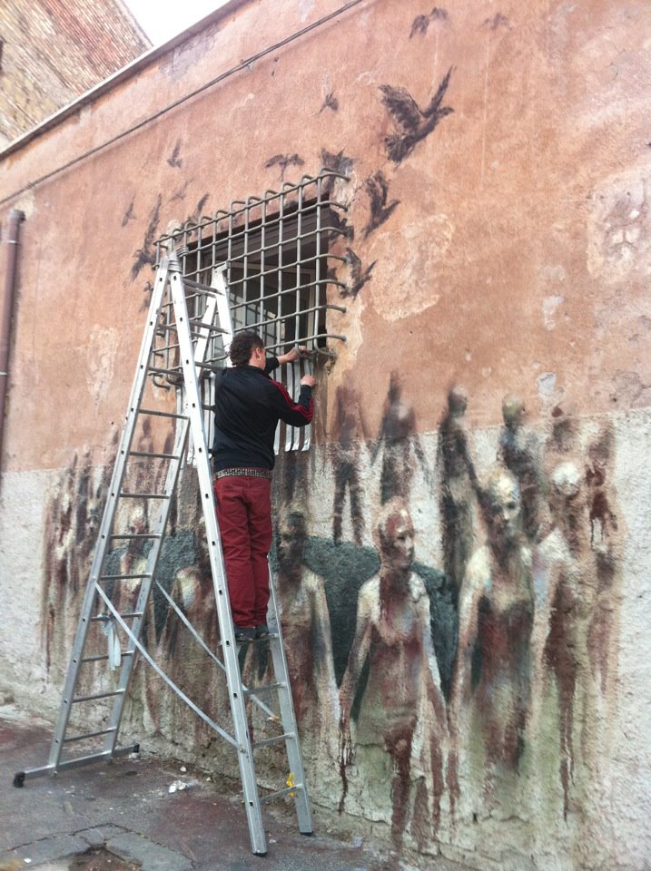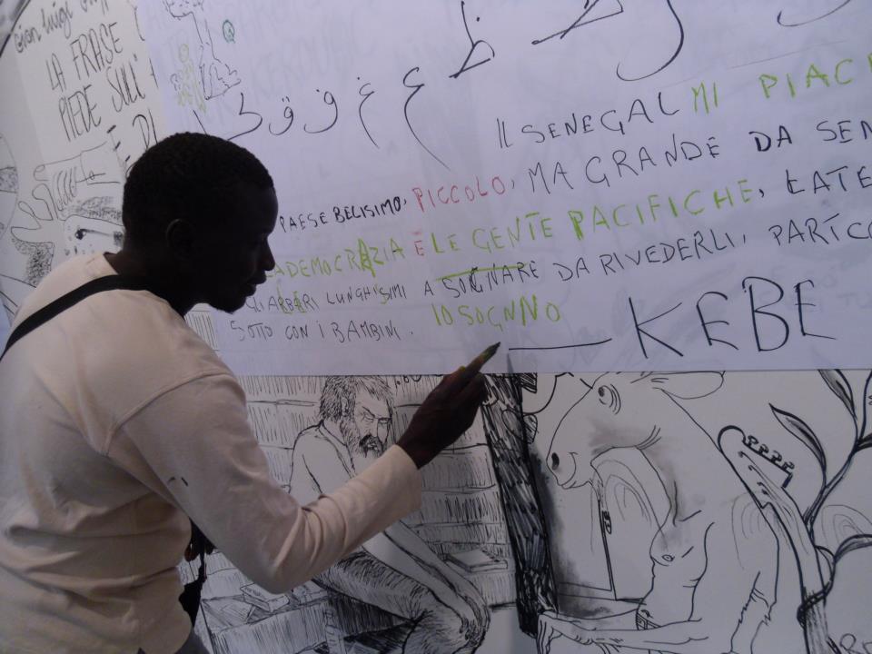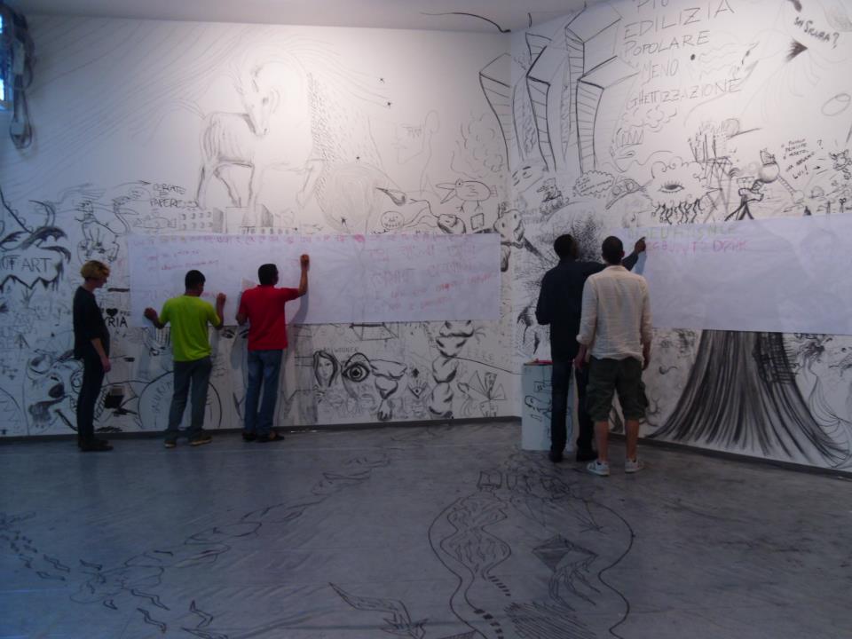 Then, a recent example of this crossing border organizing could be the Draftmen Congress [www.solidarityaction.istitutosvizzero.it] based in ESC atelier, in cooperation with the 7. Berlin Biennale of Art. We transformed ESC in a white, empty space, where people could enter, take colors or pencils and draw or write on the walls: in this way the boundary between artist and observer collapsed. We did a lesson of Italian language school on the wall of ESC, using the images and drawings as a process of knowledge production, shared with their teachers who are students of the university. In this way, the learning of language escapes from the vertical relation between teacher and student, the language itself became less of a border, and more part of the same process of redefinition of knowledge and learning.