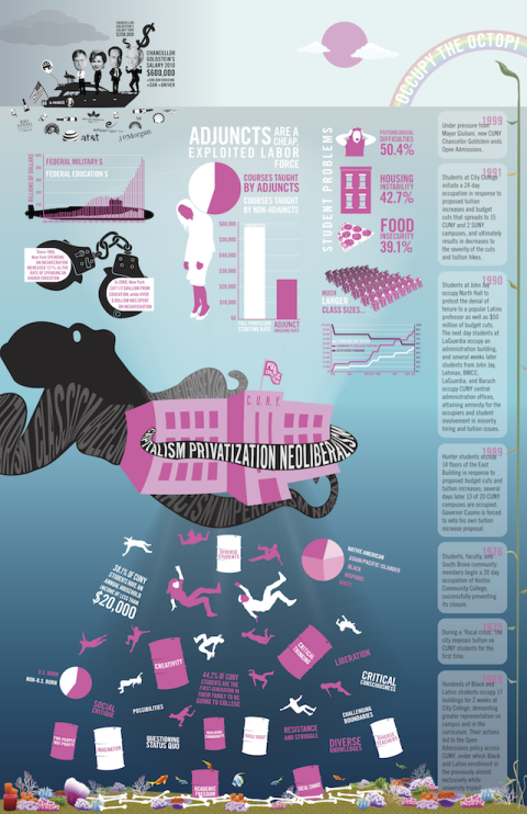There was another poster created in the Fall of 2011 about CUNY, which represented educational capitalism as an octopus. That poster was integral to creating Occupy CUNY. There was a teach-in using that poster in Washington Square Park, in the early fall, after Occupy Wall Street had started, but before the general assemblies had gotten really big. That teach-in was really well attended. I was at that teach-in but dealing with another issue. There were all kinds of people at that teach-in, from undergraduates to faculty, but mostly graduate students. As far as I know, that poster was never used in classrooms, but it remained an important tool that people learned about CUNY through. It just never became a systematic project of Occupy CUNY to take that into the classrooms. It was really just happening informally by the people who were in Occupy CUNY and were teaching.